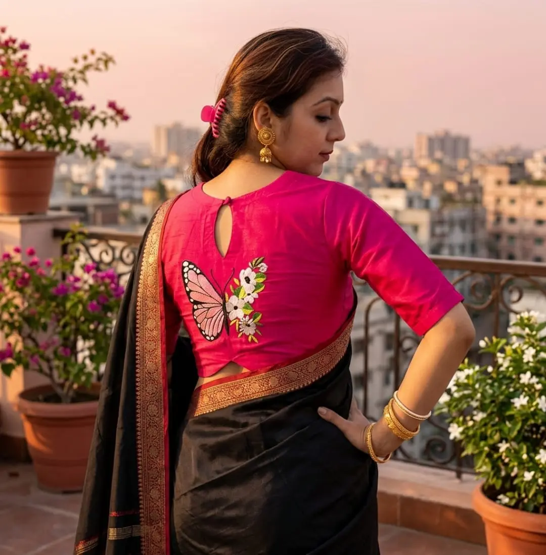 Enhance your ethnic look with this trendy pink butterfly blouse for saree, designed to bring a fresh and modern touch to traditional fashion. The back features a beautiful butterfly motif combined with floral elements, creating a unique and eye-catching design. Crafted from high-quality fabric, this blouse ensures comfort, durability, and a perfect fit for all-day wear. The vibrant pink color adds charm and brightness, making it ideal for festive occasions, weddings, and casual ethnic styling. This blouse pairs beautifully with cotton, silk, or designer sarees, making it a versatile choice for Durga Puja, parties, and special events. Add this stylish handcrafted blouse from Craftzone to your collection and stand out with elegant and contemporary ethnic fashion.